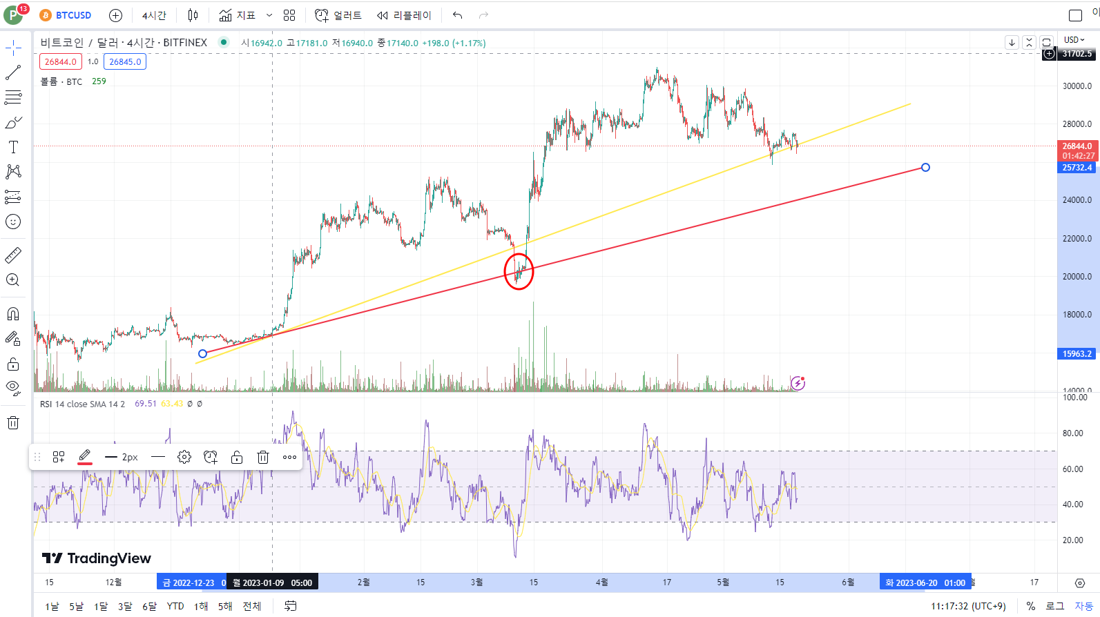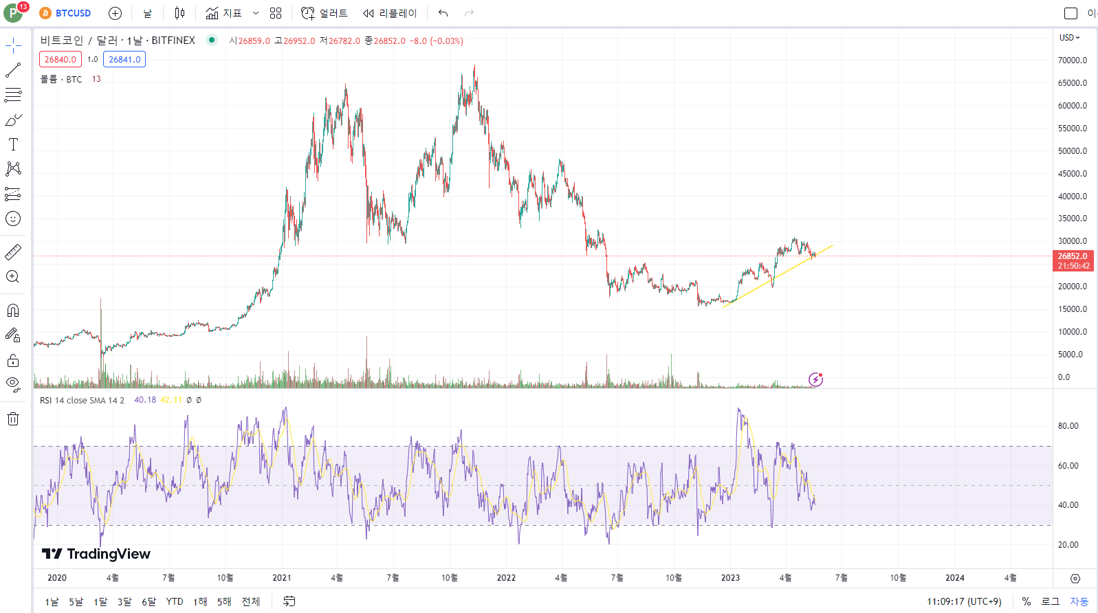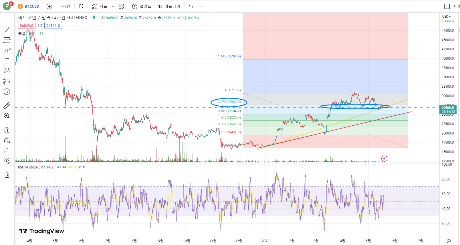 아래의 비트코인 차트를 보겠습니다.
