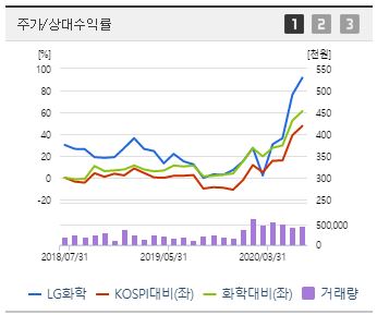LG화학은 코스피의 상승률을 훨씬 뛰어넘는 주가 상승을 보여주고 있습니다. LG화학의 주가를 3개월 전과 비교해보면 4월달의 30만 원 초반보다 약 40% 이상이 급등하였습니다. 게다가 모든 증권사에서 이를 인지하고 줄줄이 목표 주가를 상향하였습니다. 이미 연초 대비 30% 이상, 52주 최저가 대비 2배 가까이 올랐지만 목표 주가를 50만원 중후반 심지어 60만 원까지 상향 조정한 증권사들이 있습니다.