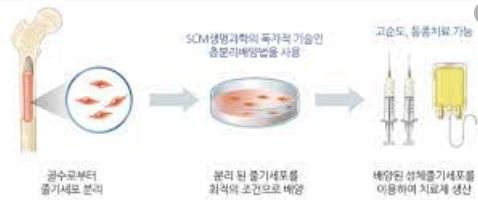 현재 의료계에서 줄기세포는 환자의 몸에 거부감이 없는 치료제로 각광받고 있습니다. 환자 본인의 몸에서 추출한 줄기세포를 사용해서 다른 부분의 치료에 이용하는 것이라서 많은 장점이 있습니다. 예를 들어 정형외과에서는 줄기세포를 신체의 연골 등에서 뽑아내서 환자 본인의 다른 신체 부분의 연골 등에 주입하여 재생할 수 있도록 하는 치료가 많이 이뤄지고 있습니다.