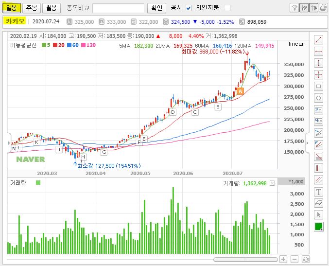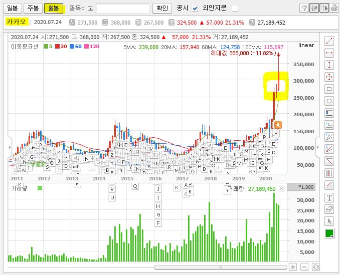 안녕하세요 주식 시장에서 국민 모바일 메신저인 카카오톡을 만든 카카오가 굉장한 이슈입니다. 언택트 비대면 대장주인 네이버와 더불어 카카오는 엄청난 시총 순위의 약진이 있었습니다. 카카오는 코스피 기준 8위로 이제 국내에서 대기업 중에서도 순위권 회사가 되었습니다. 코로나 19로 인하여 비대면 기업으로써 2020년에 비약적인 성장이 있었지만, 엄밀히 말하면 최근 몇 년간 지속적인 성장과 잠재력을 보유하고 있었습니다. 오늘은 1. 카카오의 잠재력, 2. 매출 및 기업분석, 그리고 3. 향후 주가 전망 및 매매전략 등에 대해서 알아보도록 하겠습니다.