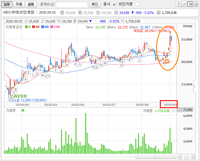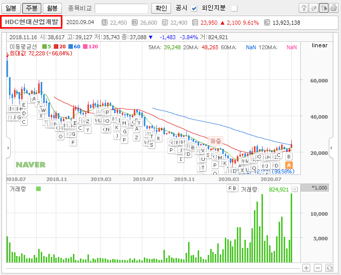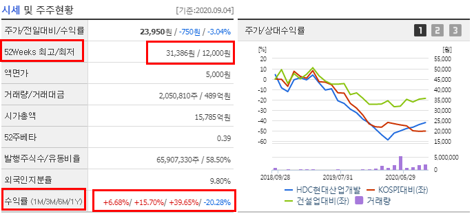 HDC현대산업개발의 52주 최고가는 31,386원에서 최저가는 12,000원으로 나타납니다. 최근 아시아나 인수 불발 가능성이 커지면서 급등하여서 그나마 회복을 한 것으로 보입니다.